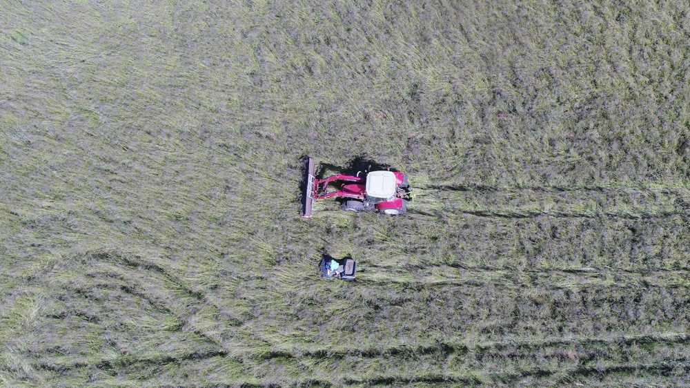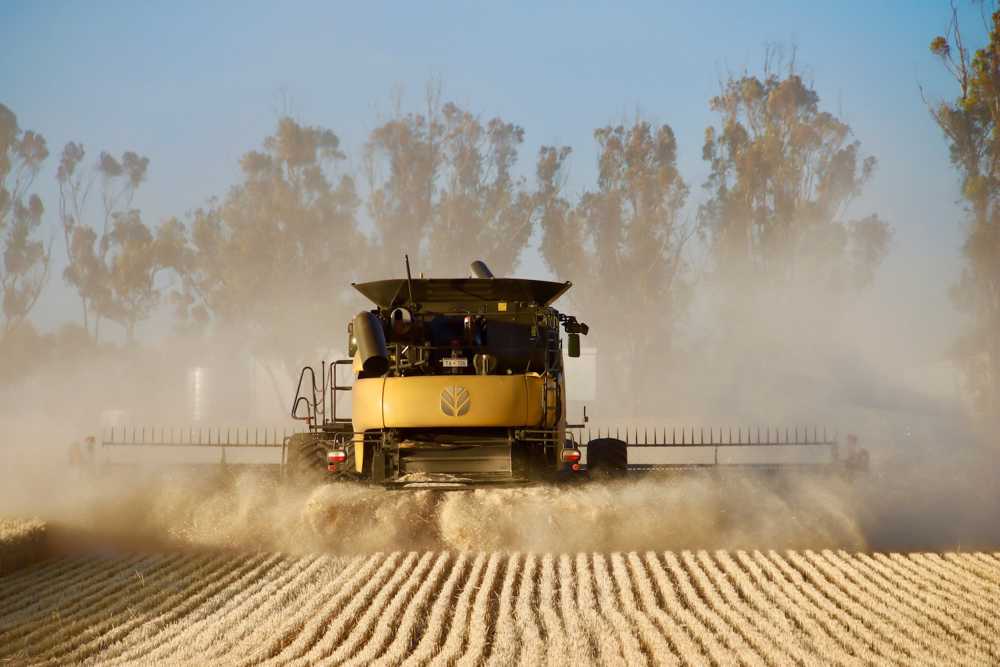 A bird’s-eye view of harvest near Warialda, with a header cutting neat lines through the crop and leaving a trail of dust across the paddock.