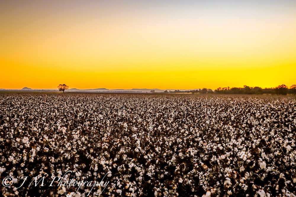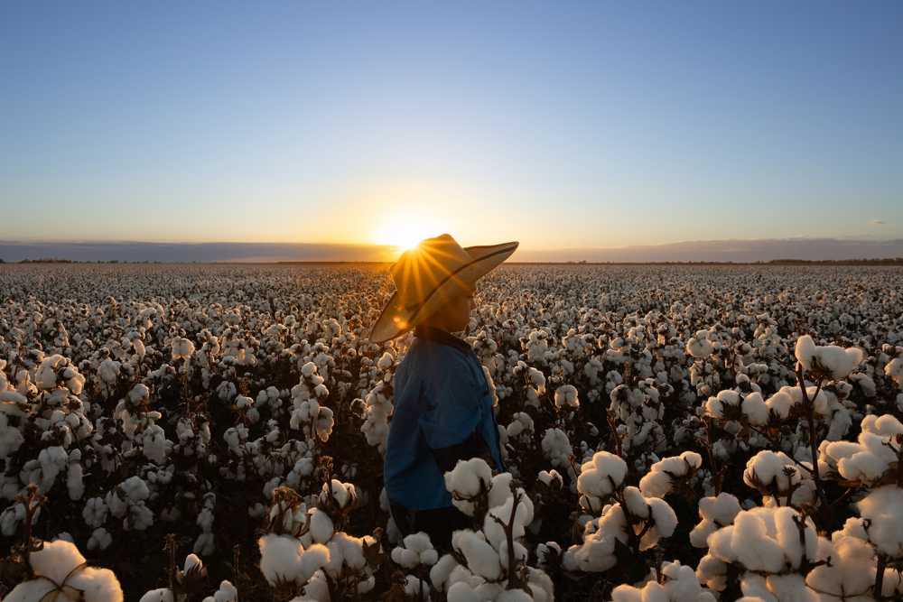 At sunset, golden light drapes across rows of cotton, where warmth and texture meet — capturing the timeless rhythm of rural life.