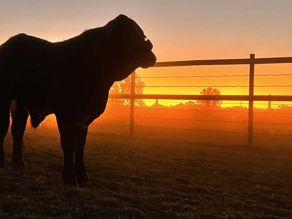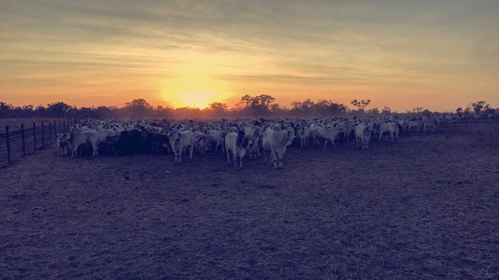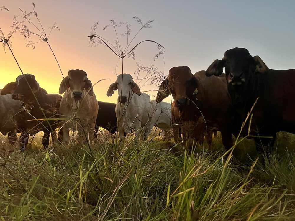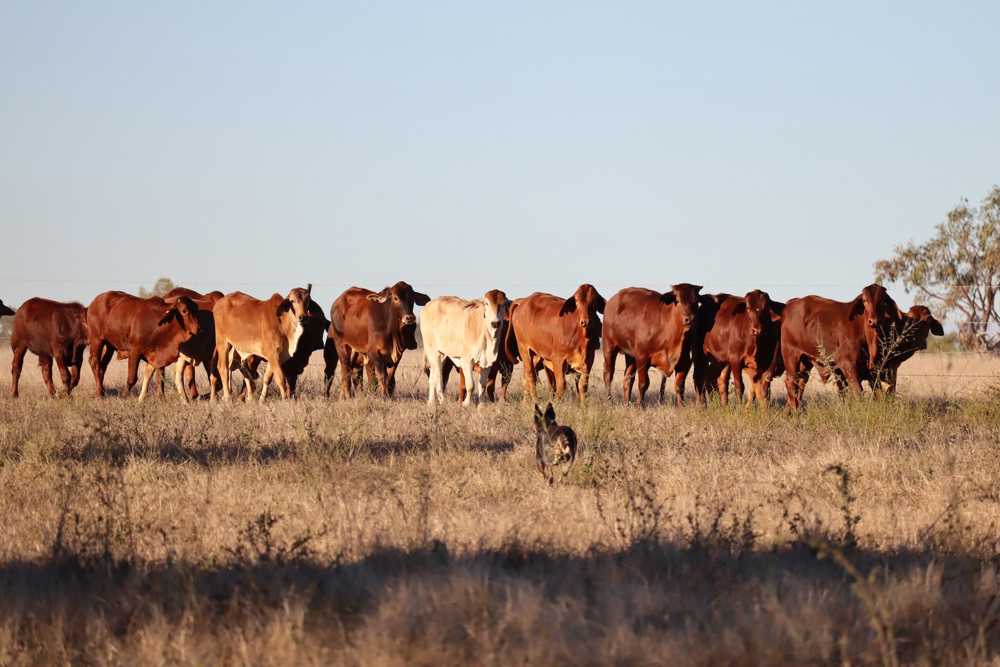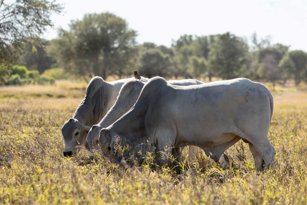 Three Brahmans graze in the Australian Outback, with a bird perched gently on one’s back — a simple scene of calm and connection creating a moment of harmony in the bush.