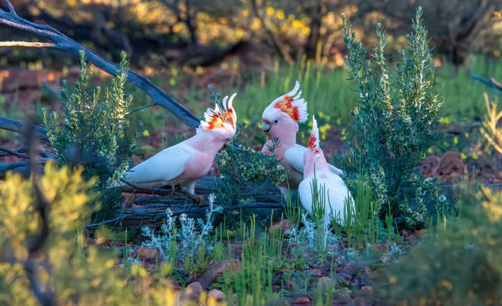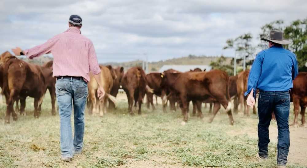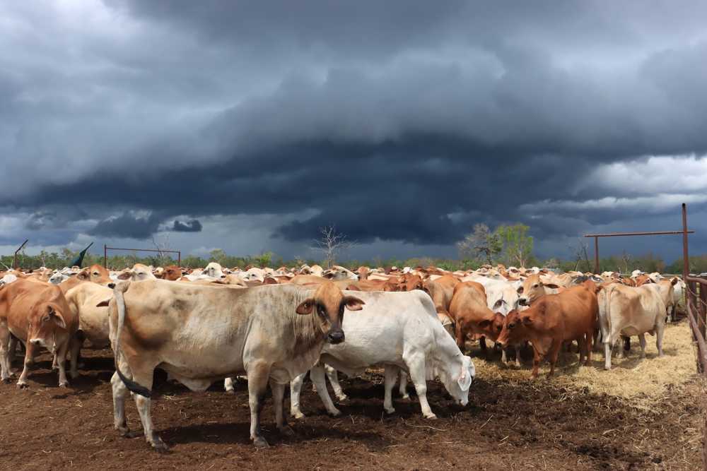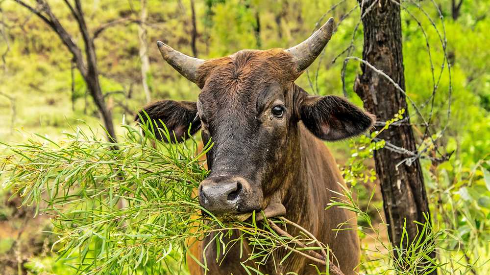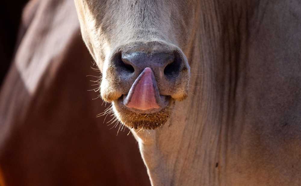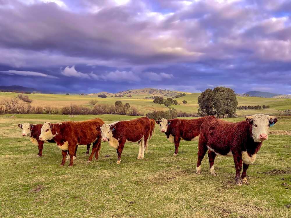 Three Brahmans graze in the Australian Outback, with a bird perched gently on one’s back — a simple scene of calm and connection creating a moment of harmony in the bush.