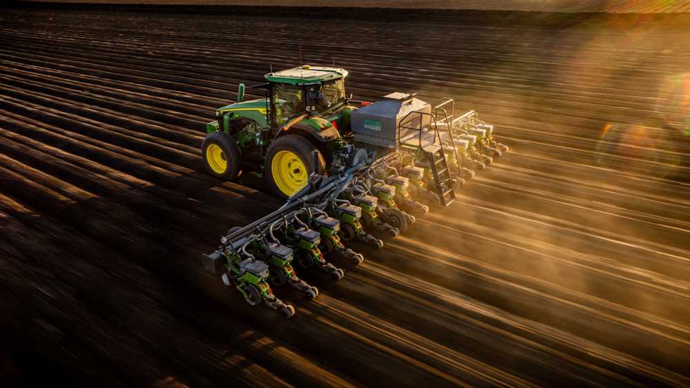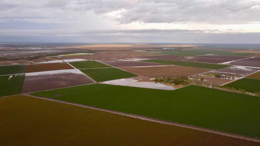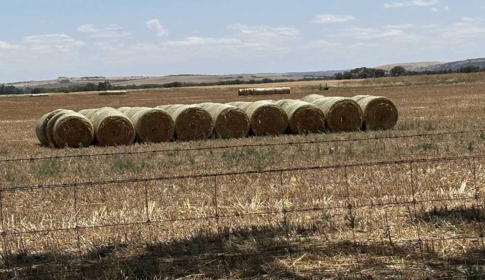 From above, two cotton pickers work in perfect rhythm, stripping neat rows across the paddock as yellow-wrapped bales scatter the field like markers of progress. A bird’s-eye view of harvest time in outback Queensland.