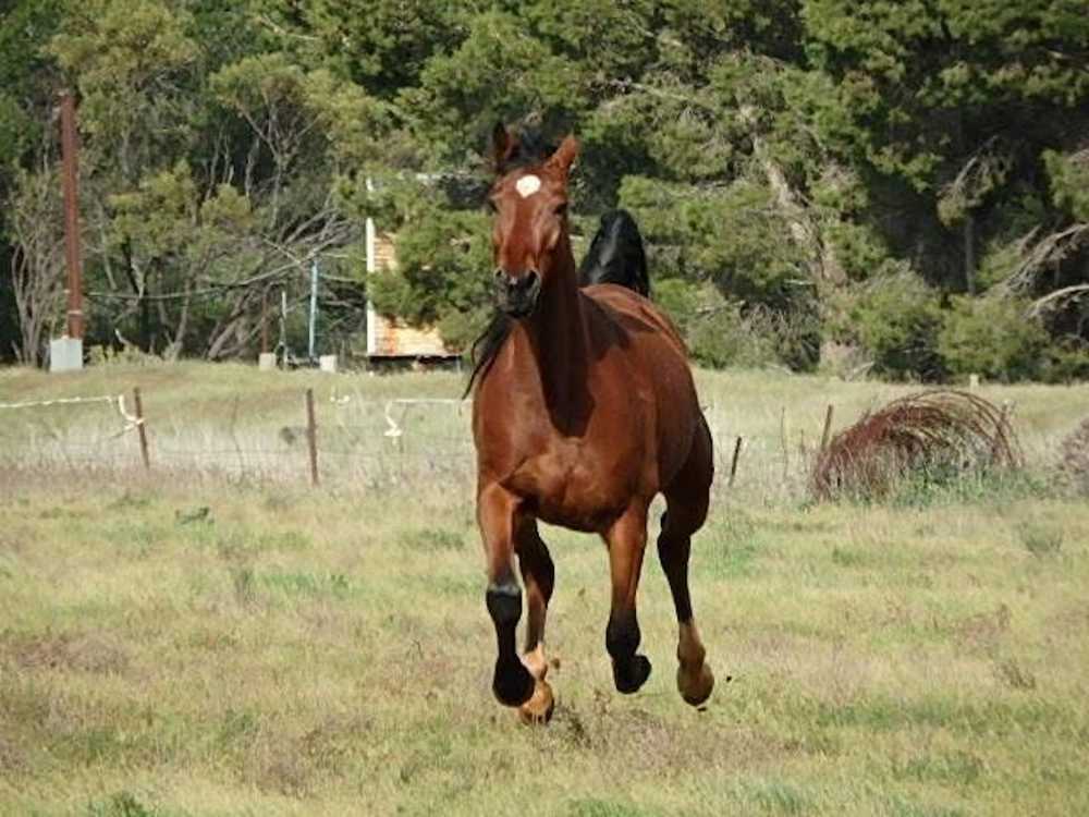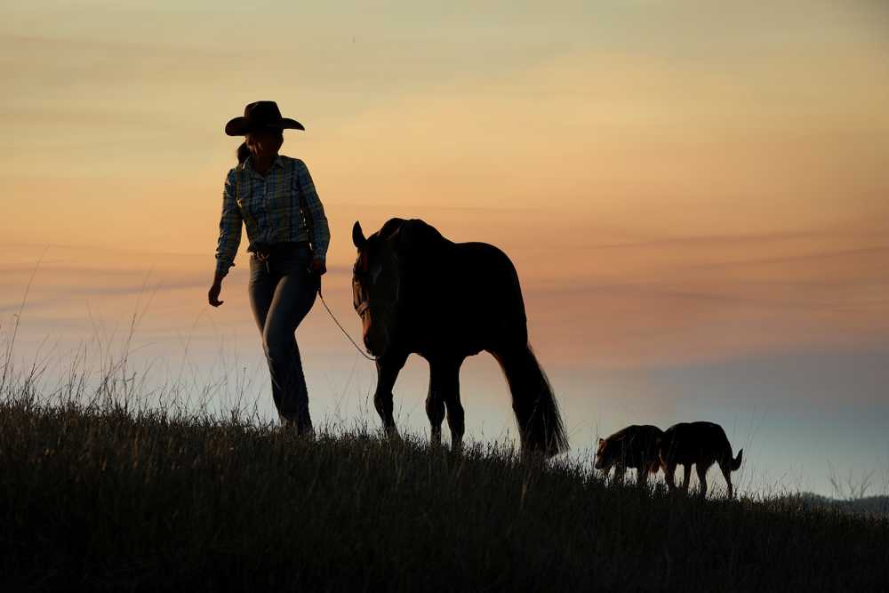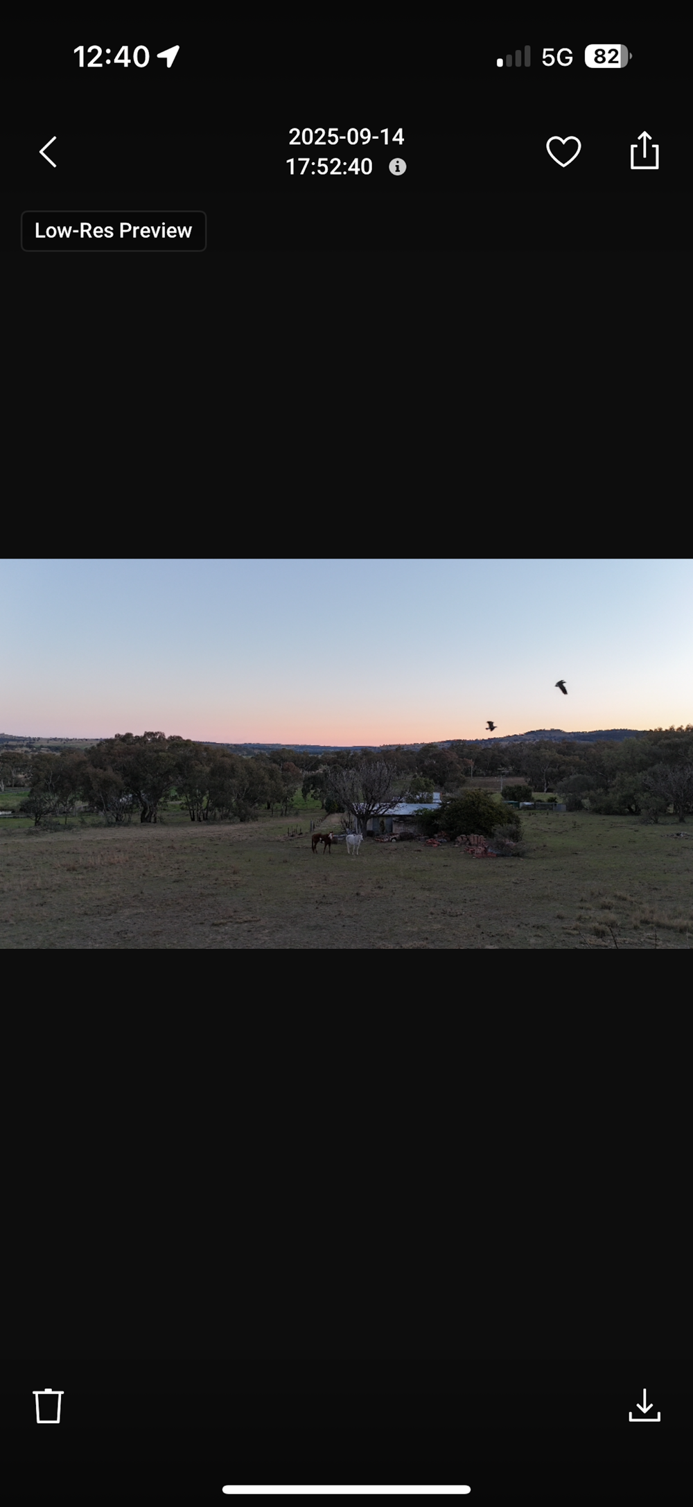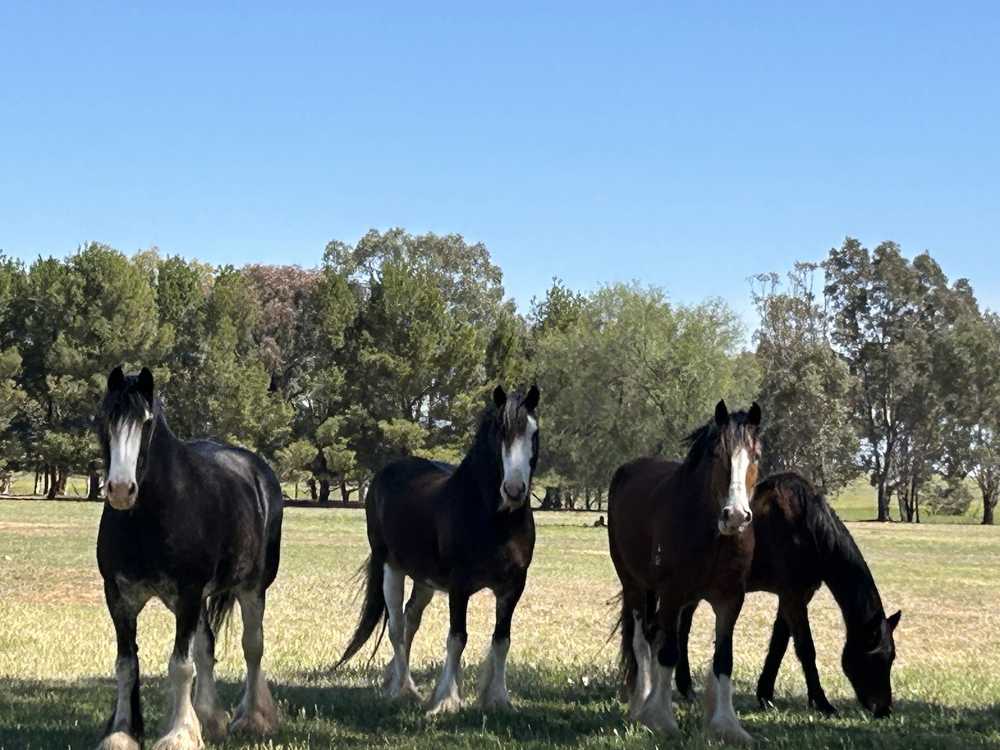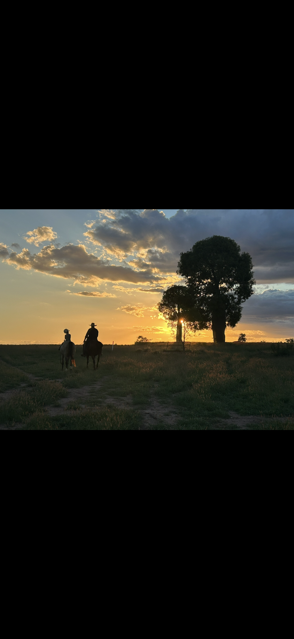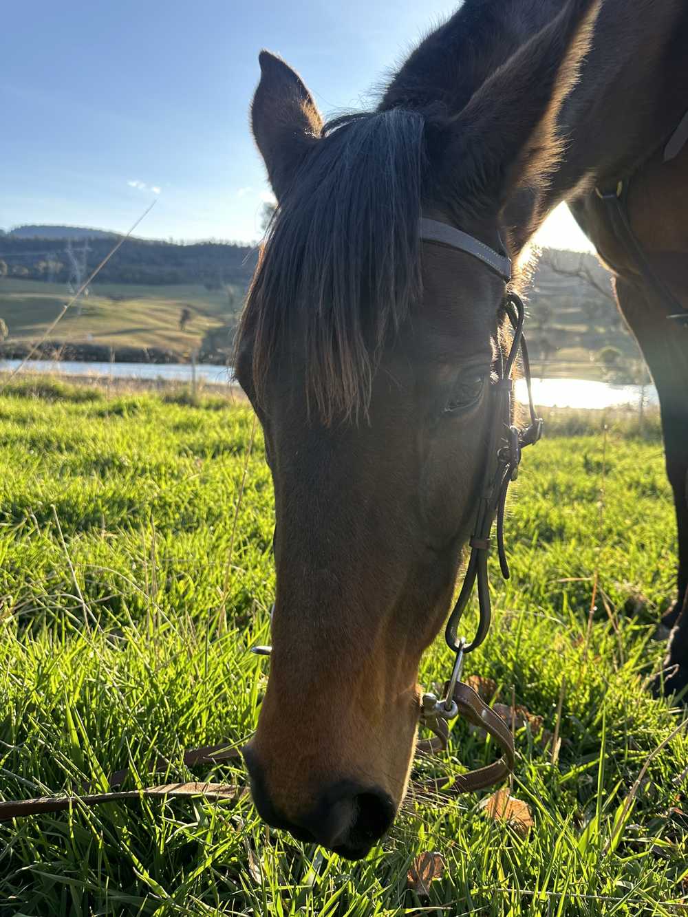 Shadow (horse) taking a moment to rest as the sunsets and watch the kangaroos in the distance