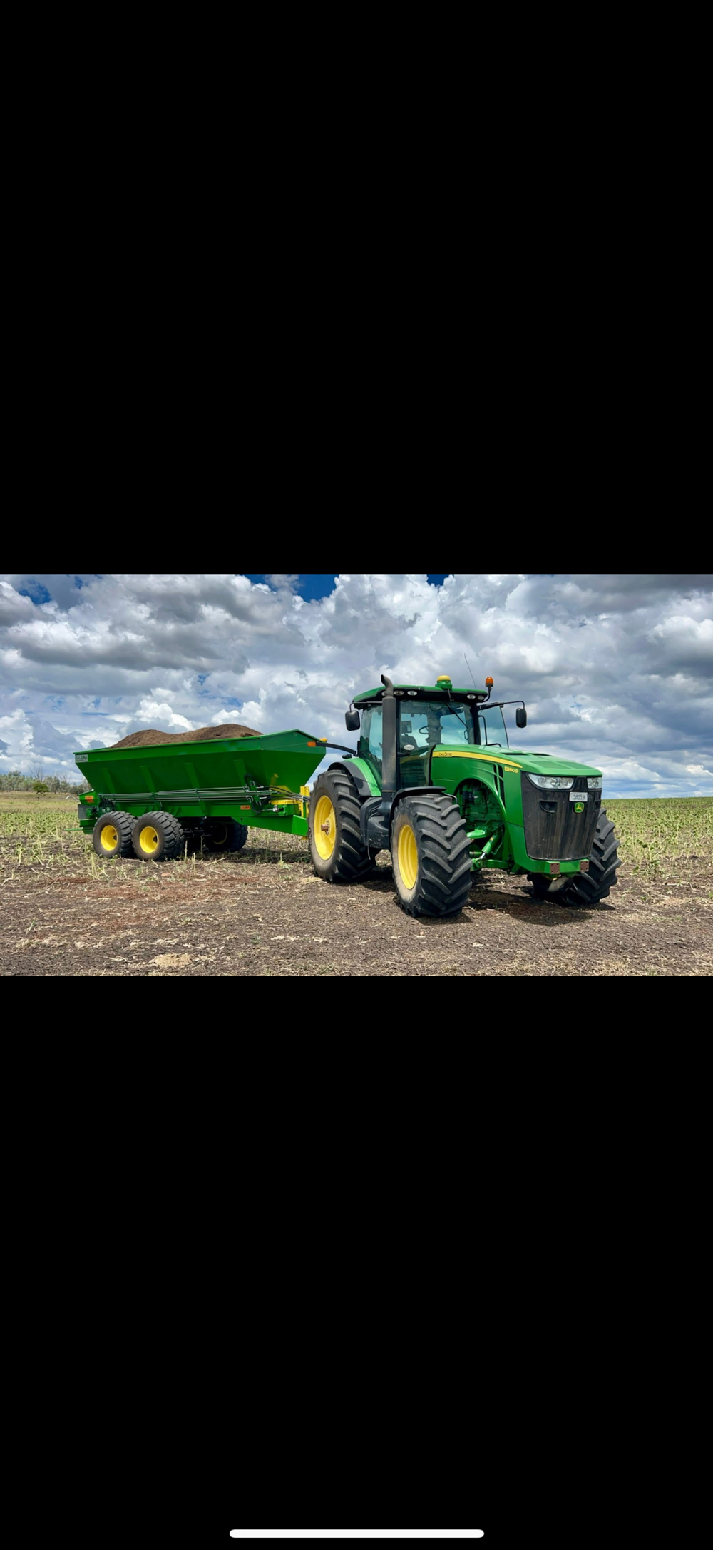 On the ground at harvest time, a John Deere header fills the chaser bin alongside, set against the dusty backdrop of north west New South Wales.