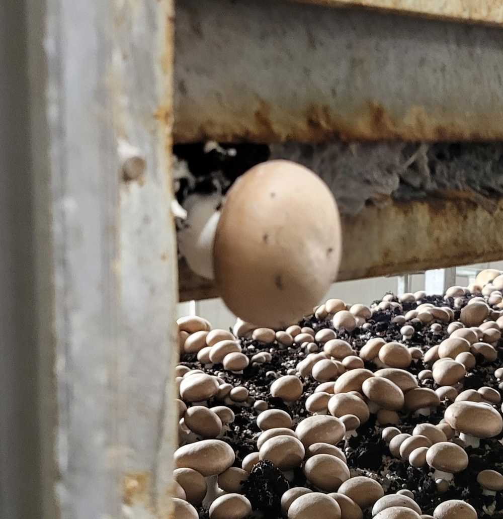 This little mushroom has escaped the carefully prepared growing beds and decided to grow underneath the compost.