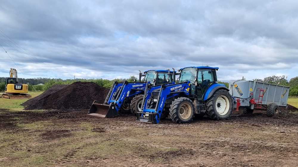Gear at rest after a day of spreading compost in a macadamia orchard