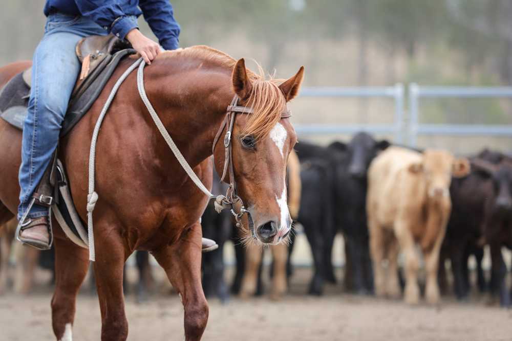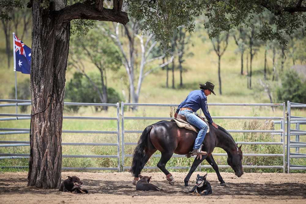 “Educating the Weaners” One man and his horse and his working dogs educating 300 weaners back down to the yards after feeding out.