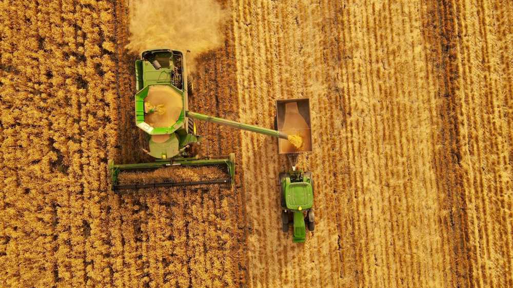 From above, a header unloads grain into a chaser bin on the move. Precision teamwork and timing keep the harvest rolling along smoothly.