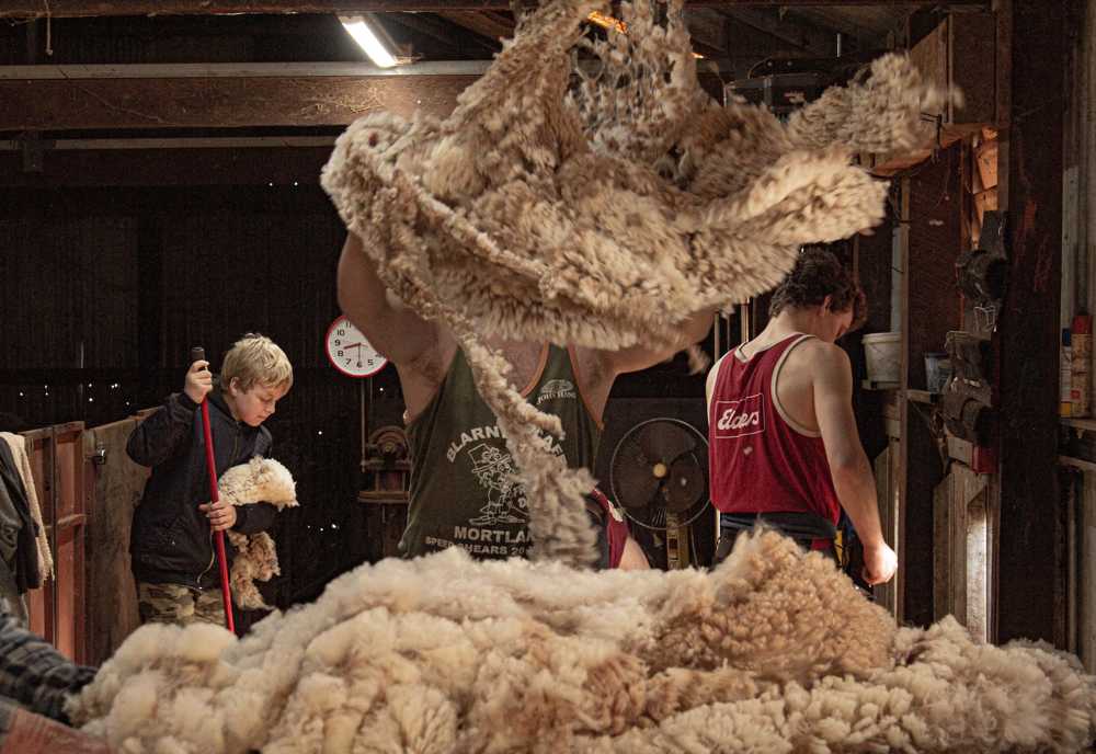 Capturing that moment in time as the fleece is tossed on the table. The contiual flow of work as the fleece is tossed, the roustabout sweeps, also holding a bellie, and the shearer prepares his comb for more shearing.
